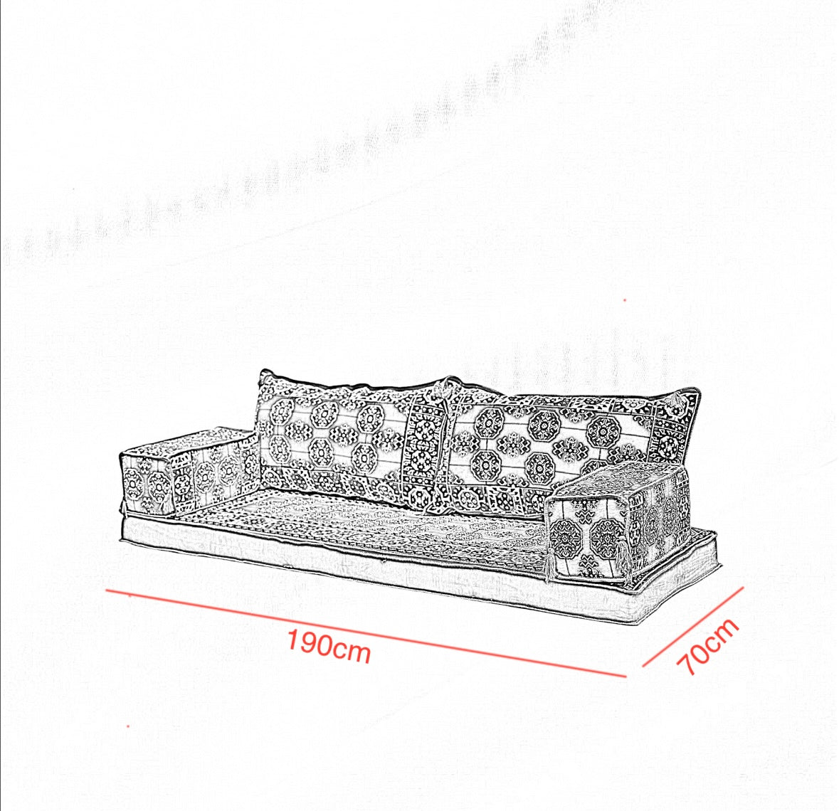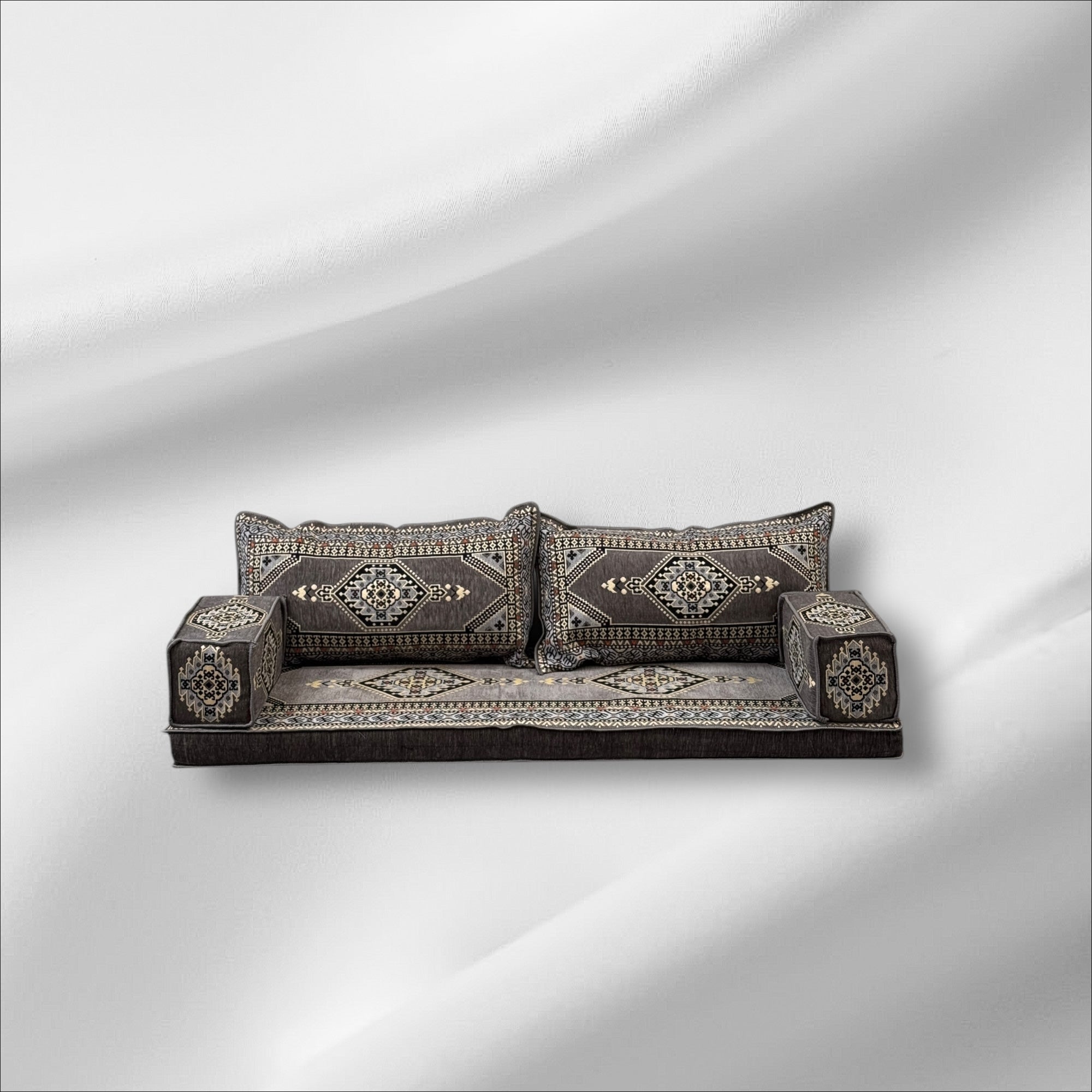 Create a cozy, welcoming space with this beautifully crafted Arabic Majlis floor seating set. Made with thick, high-quality fabric and supportive, long lasting mattress foam, it's designed for both comfort and durability, perfect for relaxing with family or hosting guests in traditional style.