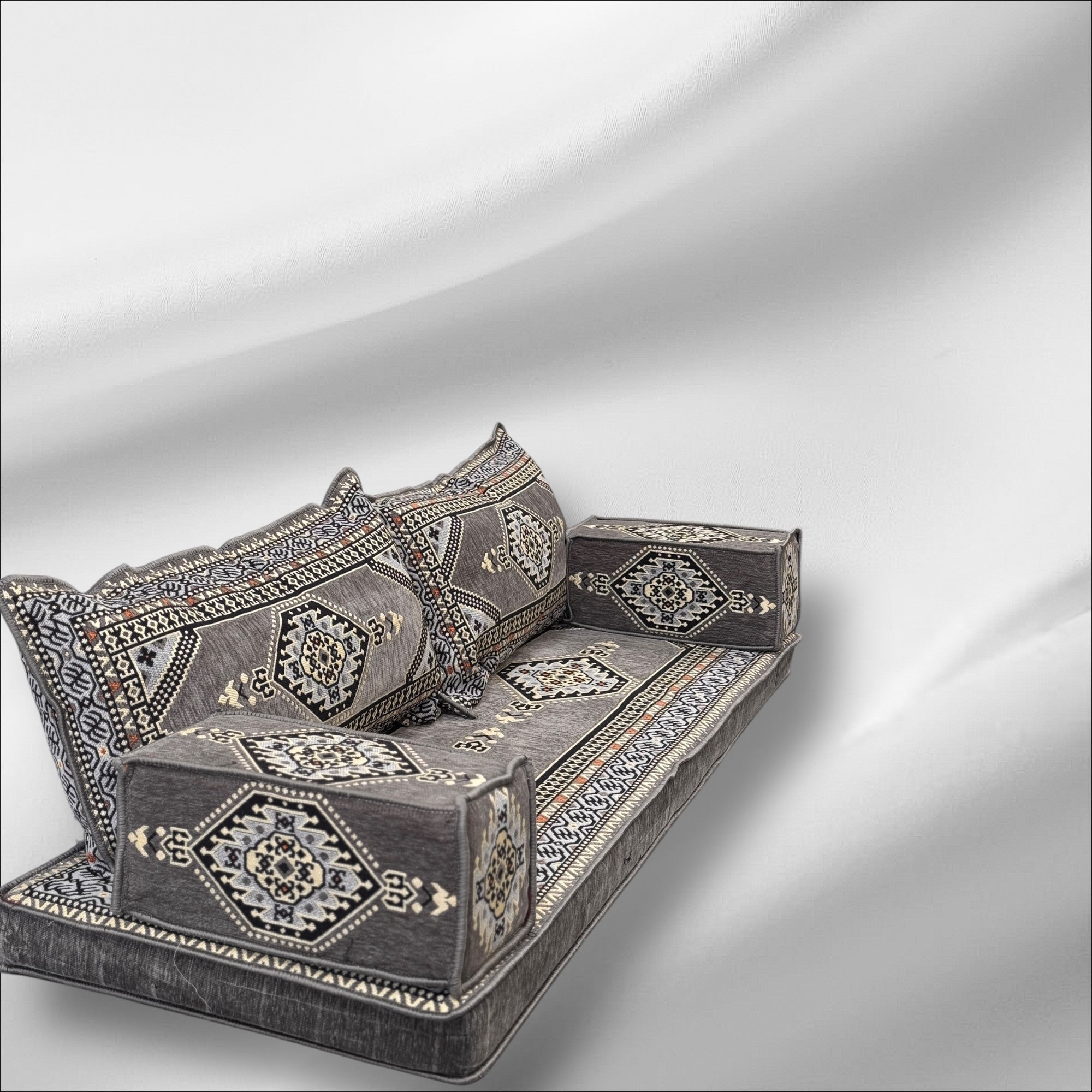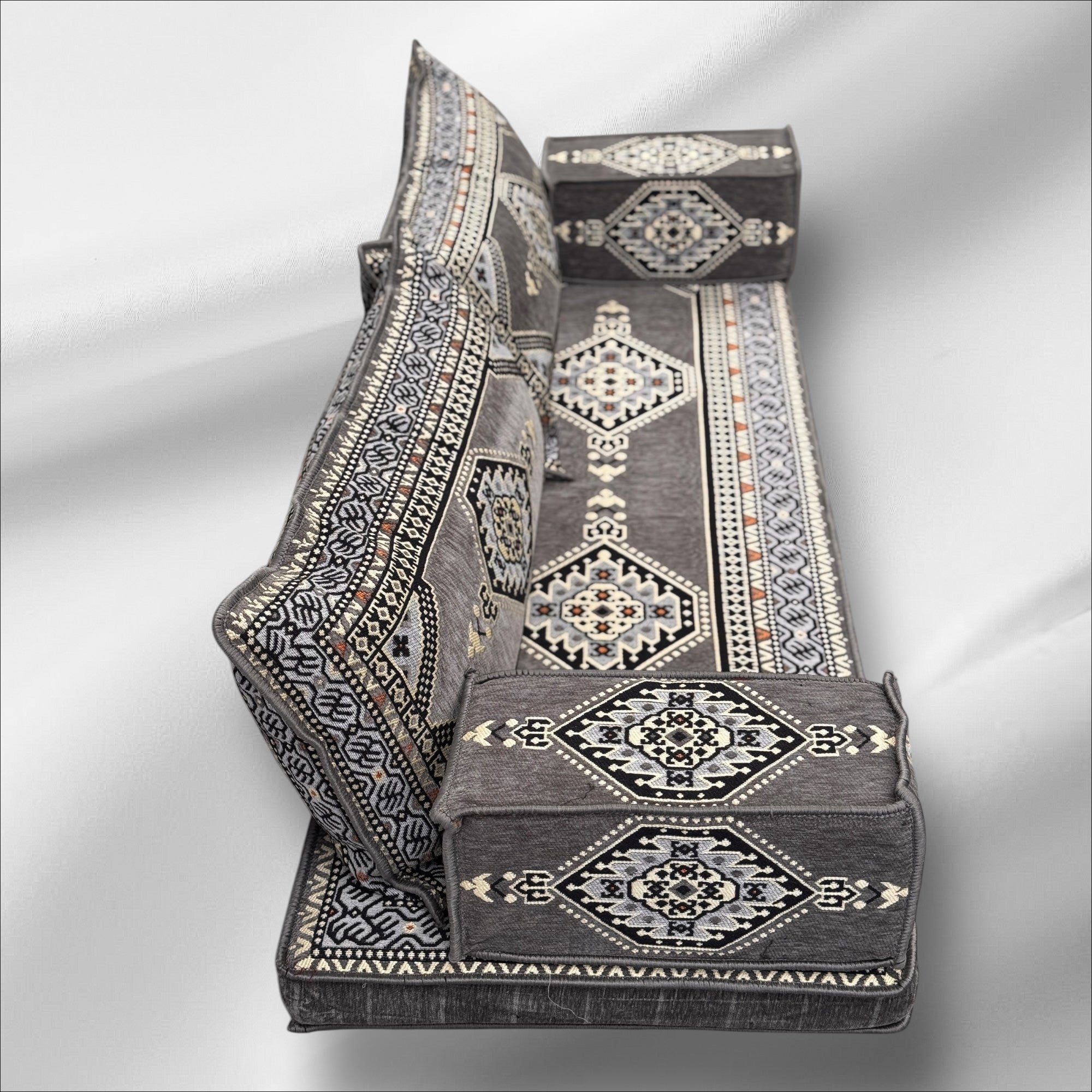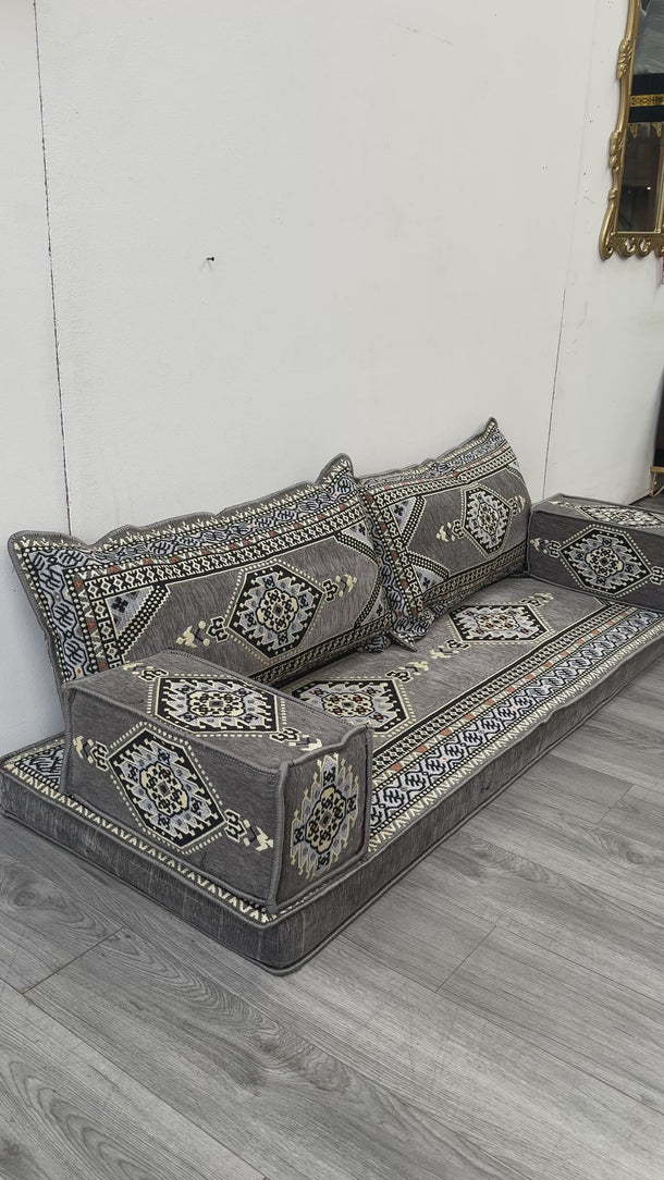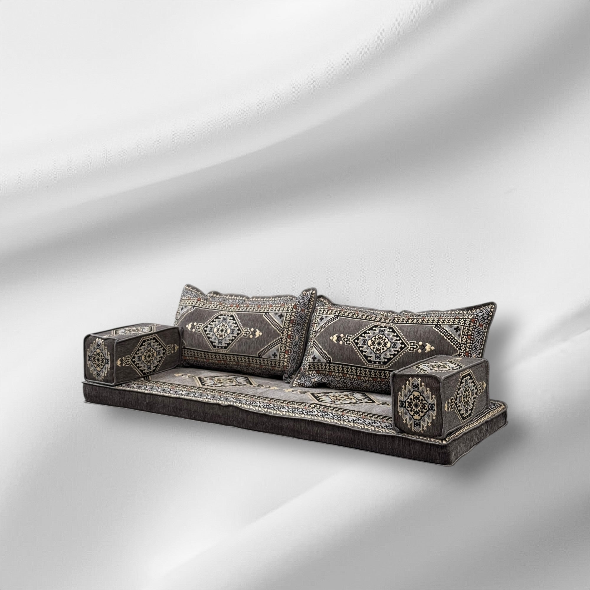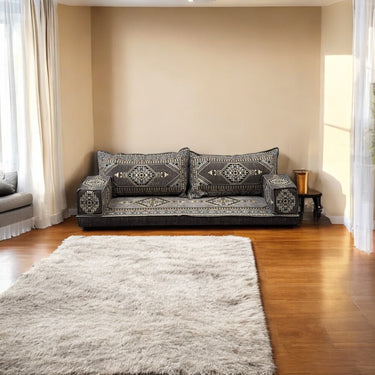 Traditional Arabic Majlis Floor Seating Sofa Set. Arabic Style Low Seating with Plush Cushions.