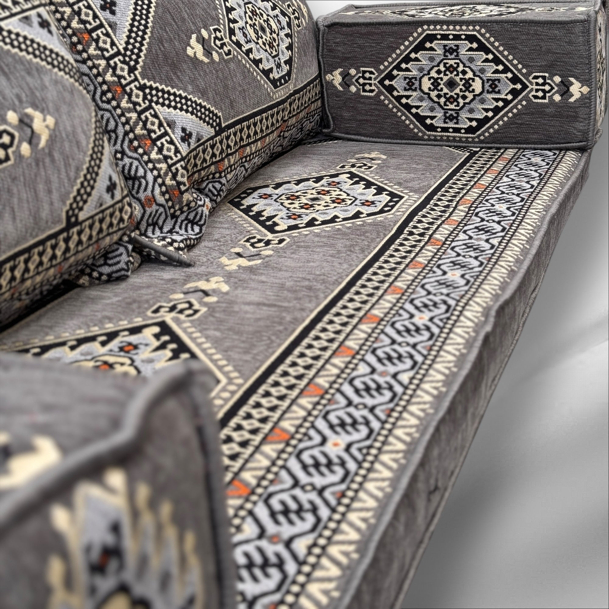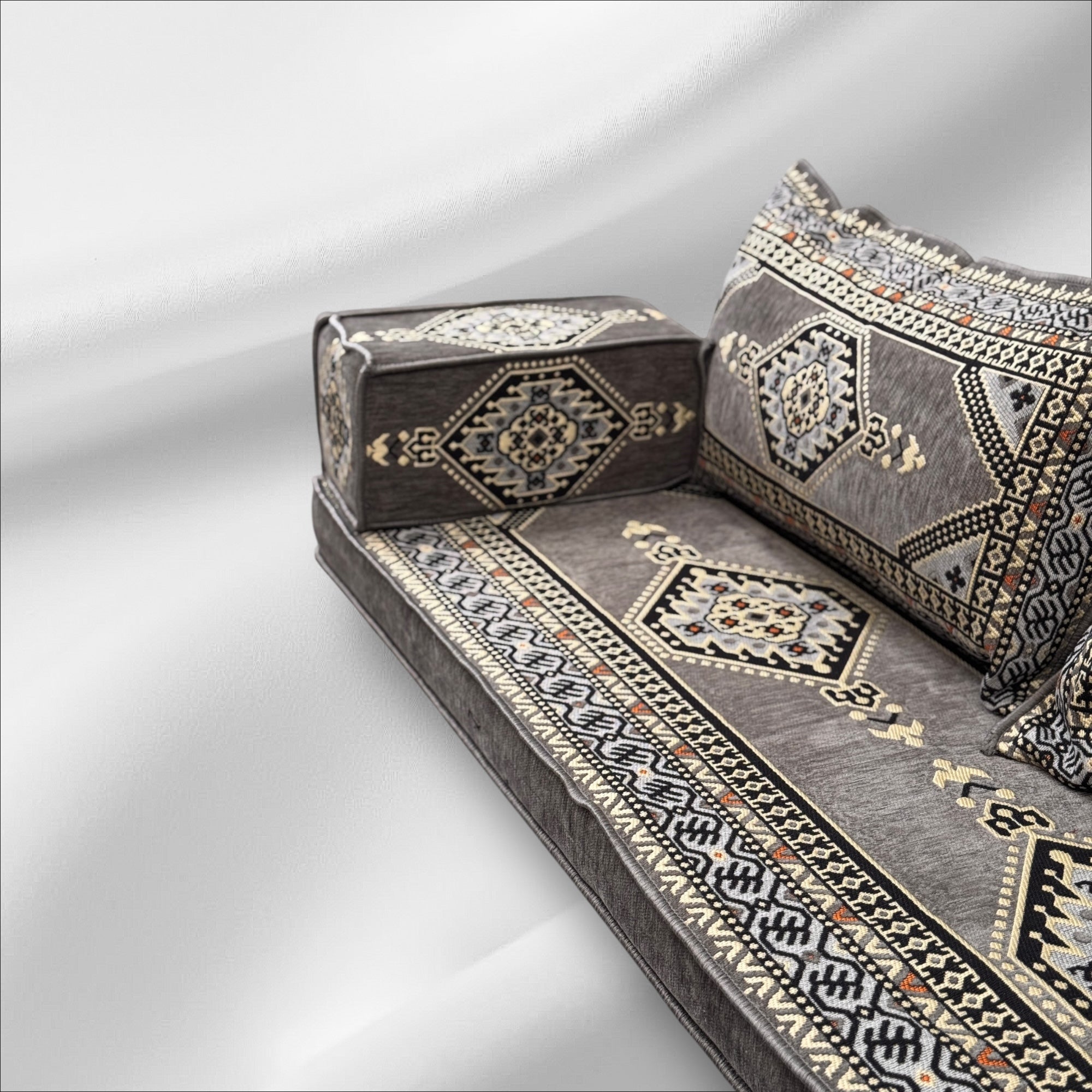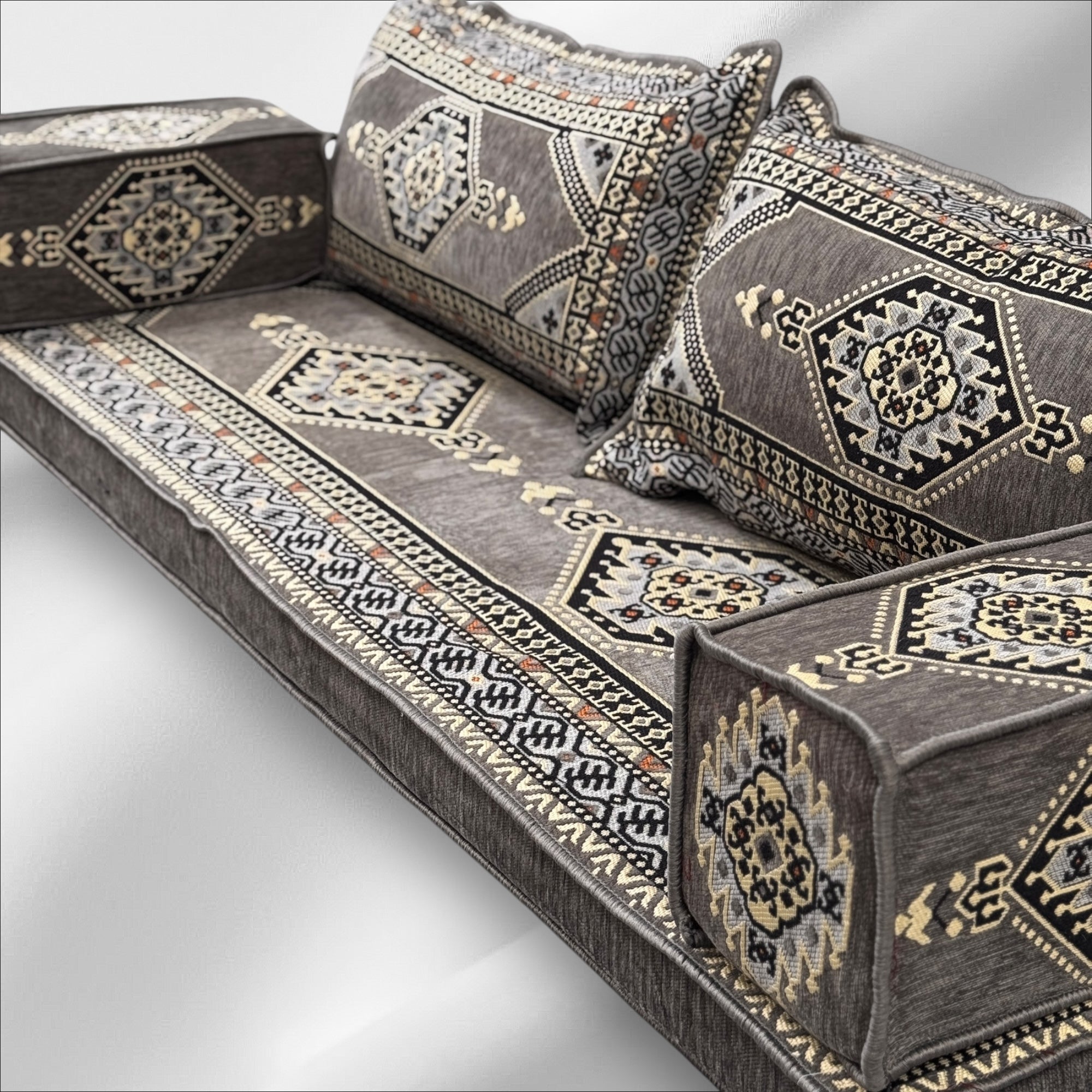 Traditional Arabic Majlis Floor Seating Sofa Set. Arabic Style Low Seating with Plush Cushions.
