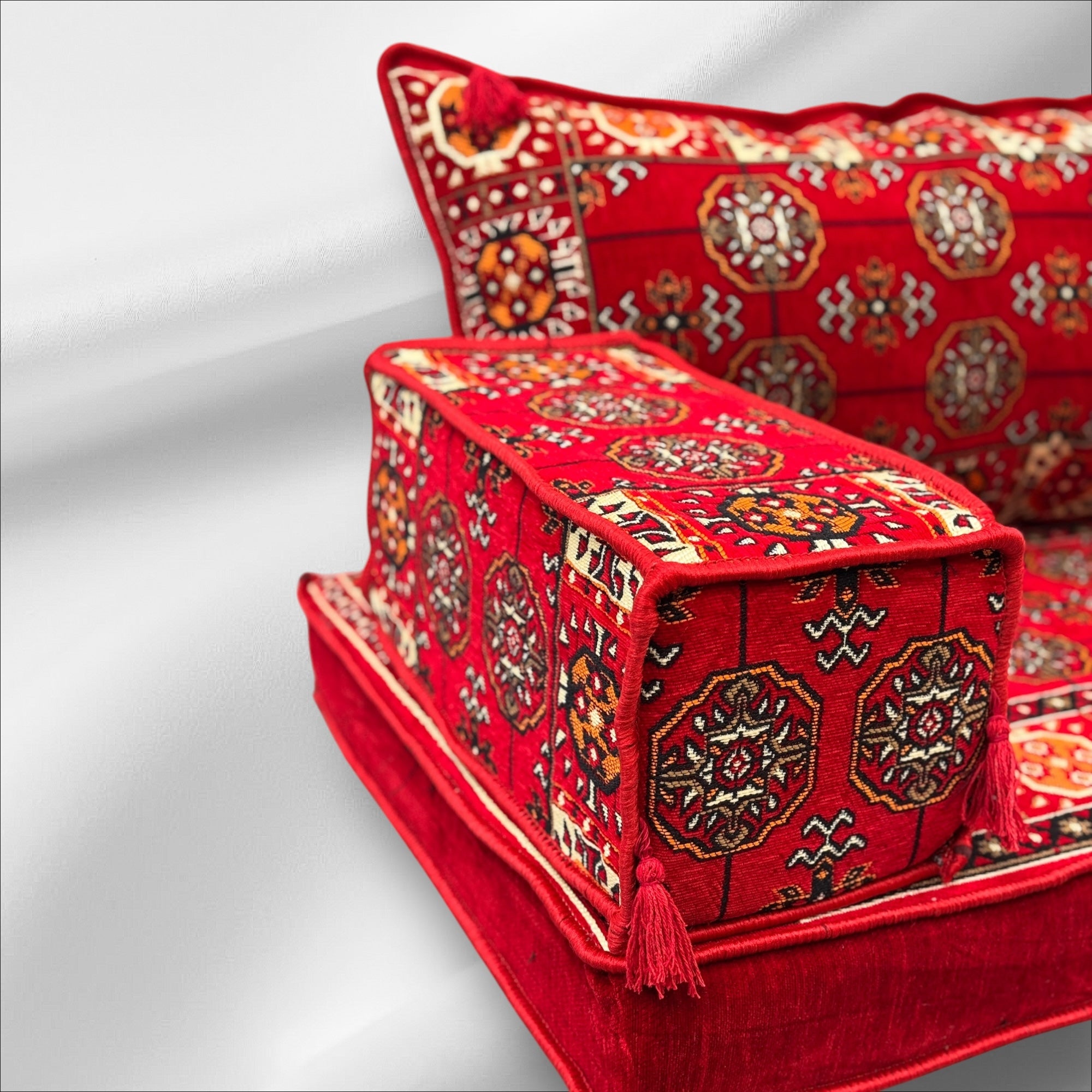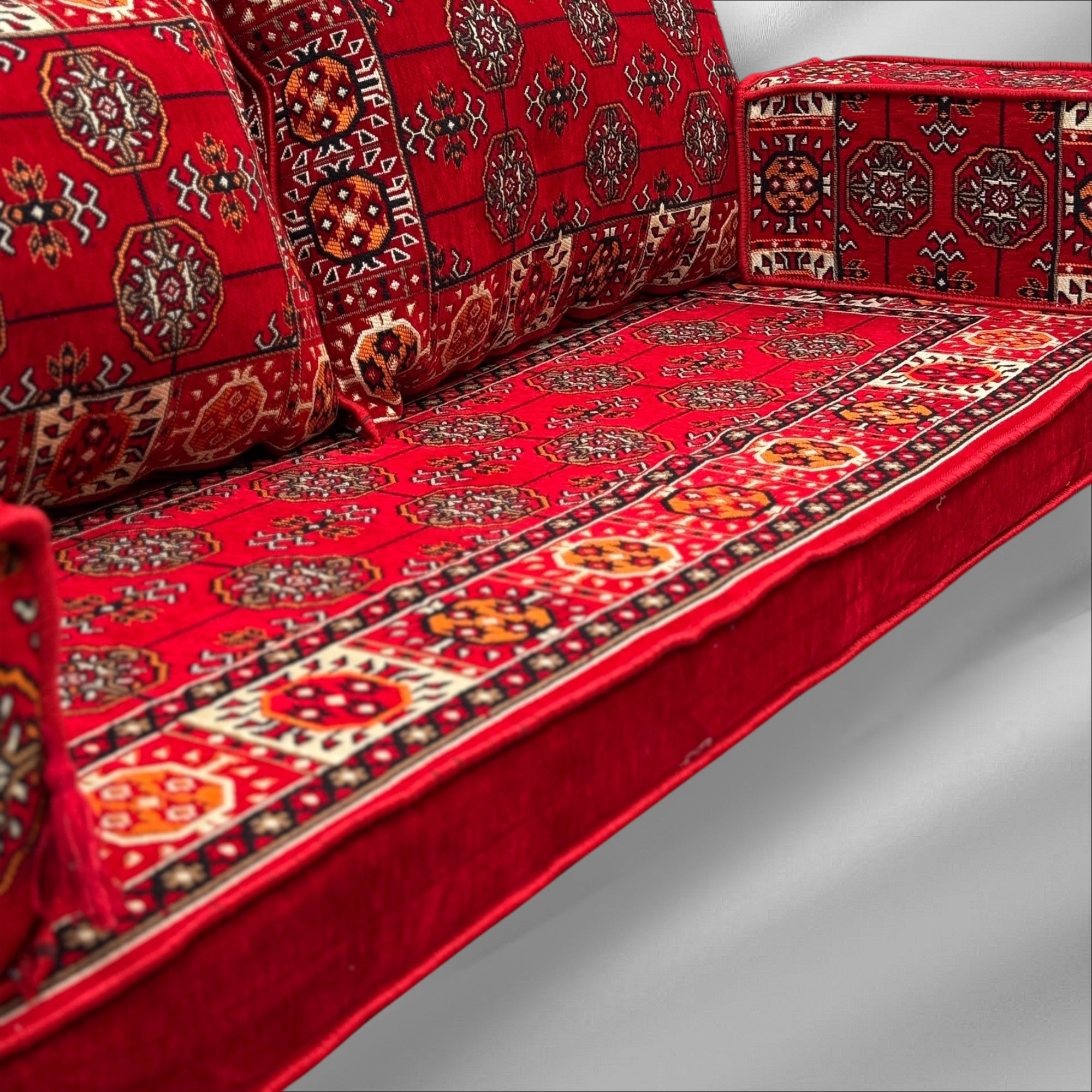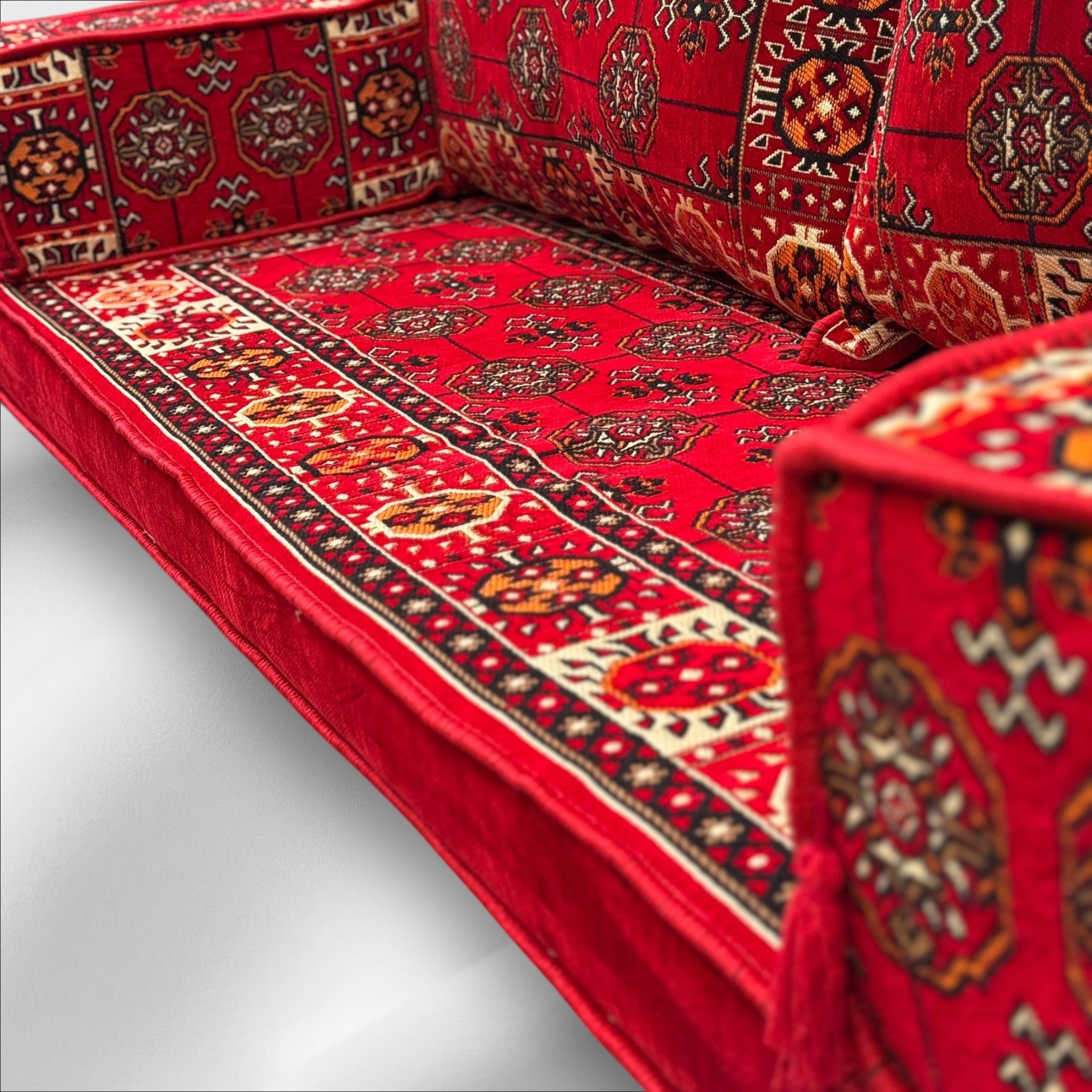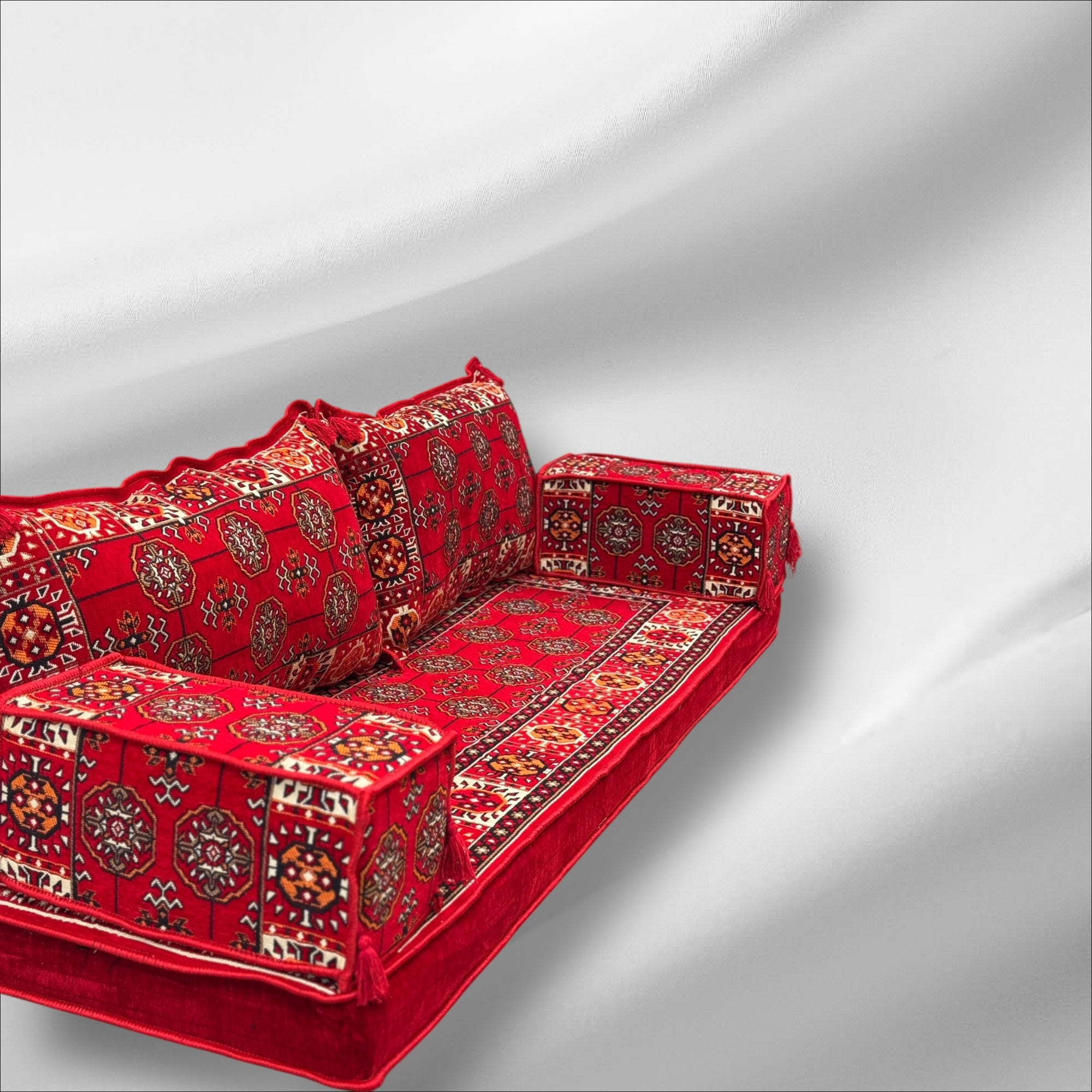 Create a cozy, welcoming space with this beautifully crafted Arabic Majlis floor seating set. Made with thick, high-quality fabric and supportive, long lasting mattress foam, it's designed for both comfort and durability, perfect for relaxing with family or hosting guests in traditional style.